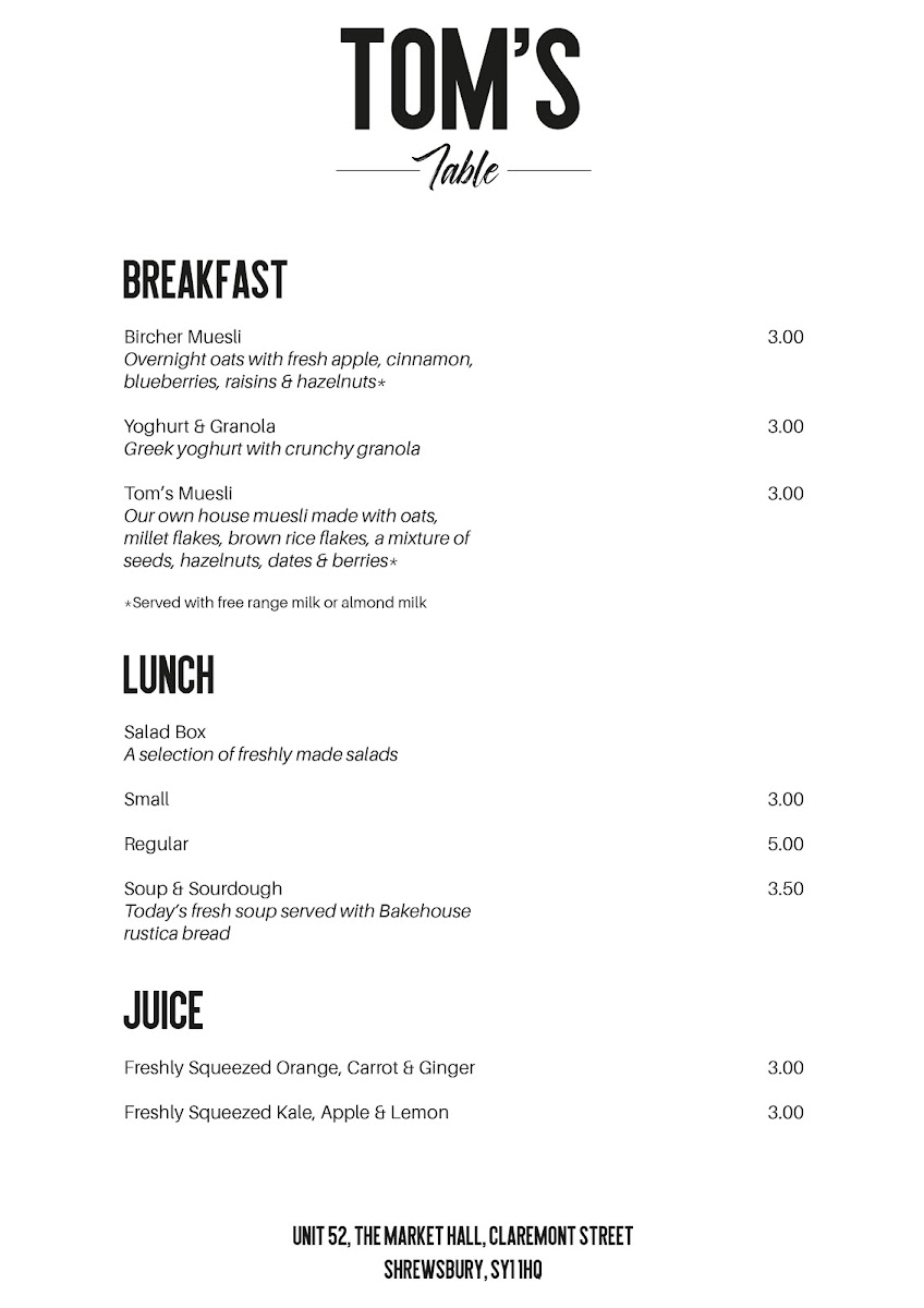 Welcome to Tom's Table, an inviting café nestled within the vibrant Market Hall of Shrewsbury, located at Unit 52, Claremont St. This delightful spot is a haven for those who appreciate fresh, wholesome food paired with a cozy atmosphere. Whether you're looking for a quick lunch or a leisurely catch-up with friends, Tom's Table is the perfect destination.